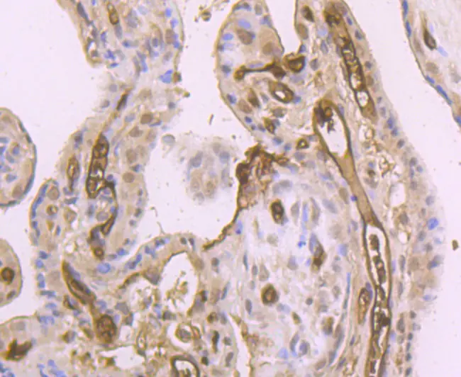 Dickkopf相关蛋白1(Dickkopf-related protein 1,DKK1)是Wnt/B-catenin信号通路的典型抑制剂,属于DKK家族(其余包括DKK2、DKK3和DKK4)。DKK1由人类DKK1基因编码,位于10q11.2,长度约为3.5kb,编码一种分子量约为28.7KDa的分泌型糖蛋白,含约266个氨基酸。DKK1的结构包括:一个N端的信号序列、两个保守的富半胱氨酸区域(Dkk_N和辅脂肪酶折叠区域)以及一个靠近蛋白C端的N-糖化位点。其信号序列由20~30个氨基酸组成,负责定位DKK1肽链在内质网,并介导DKK1的细胞外分泌。
