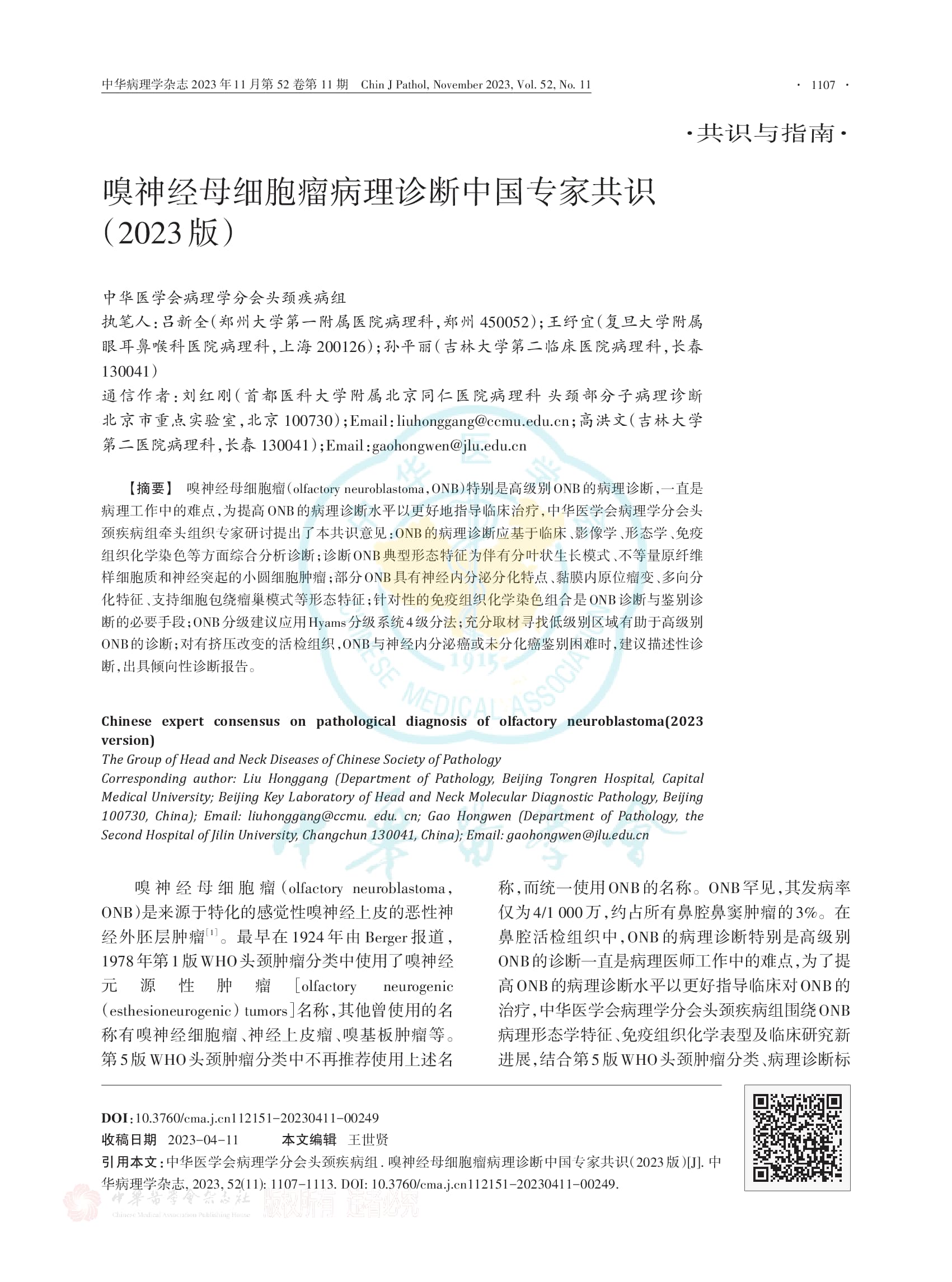 嗅神经母细胞瘤病理诊断中国专家共识(2023)